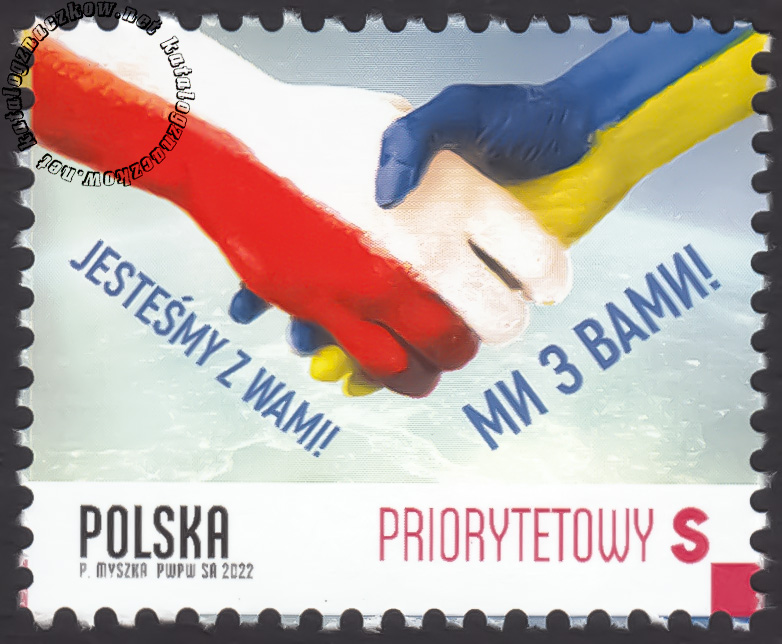 Opis: Na znaczku przedstawiono ściśnięte dłonie w barwach narodowych odpowiednio Ukrainy i Polski.