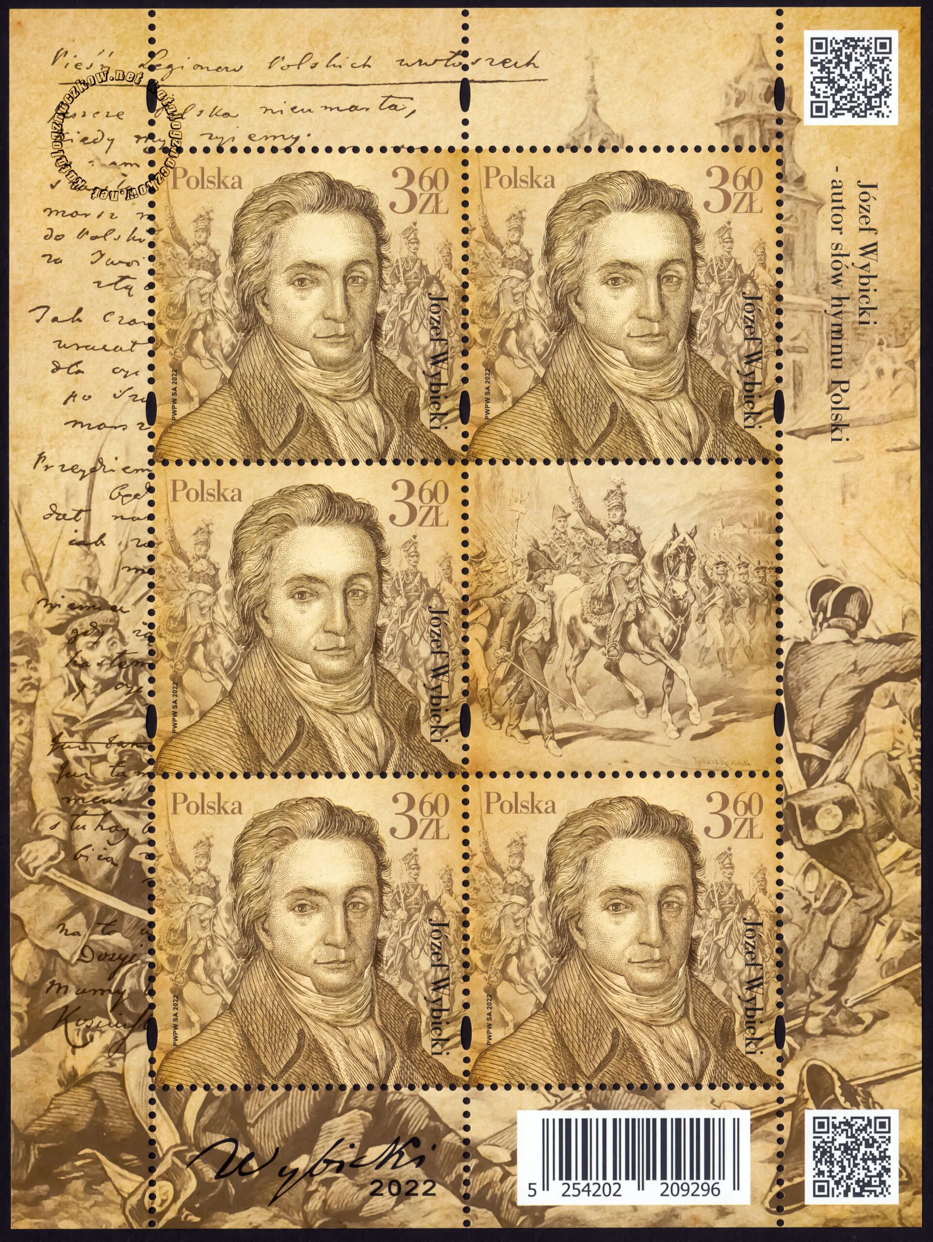 Opis: Portret Józefa Wybickiego, wg drzeworytu z 1871 r. W grafice przywieszki – rycina „Marsz, marsz Dąbrowski…” z cyklu „Pieśń Legionów” Juliusza Kossaka. W grafice oprawy arkusza – fragmenty ryciny „Niemiec, Moskal nie osiędzie…” – z cyklu „Pieśń Legionów” Juliusza Kossaka, fragmenty autografu „Pieśni Legionów Polskich we Włoszech”. W prawym górnym rogu kod QR przekierowujący do strony z nagraniem hymnu Polski w wykonaniu Reprezentacyjnego Zespołu Artystycznego Wojska Polskiego.