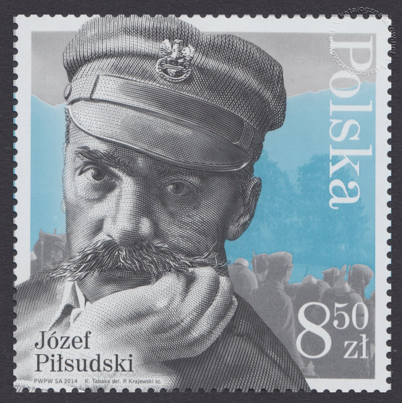Opis: Podobizna Józefa Piłsudskiego na tle fragmentu fotografii drużyny strzeleckiej