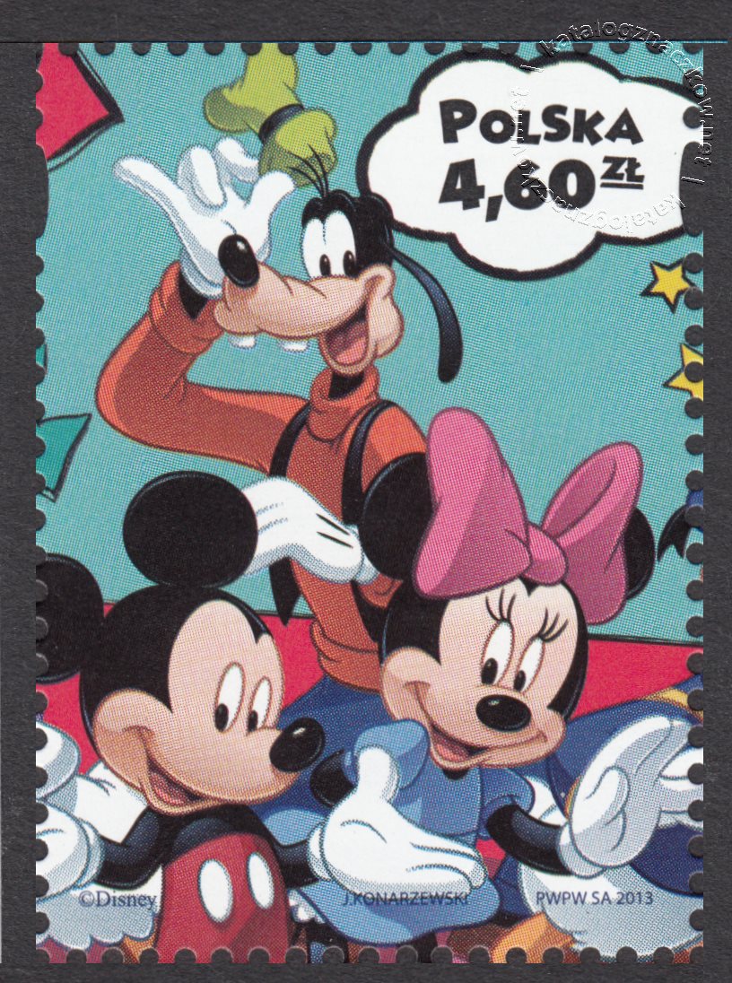 Opis: Na znaczku przedstawiono myszkę Miki, Minnie i Goofiego