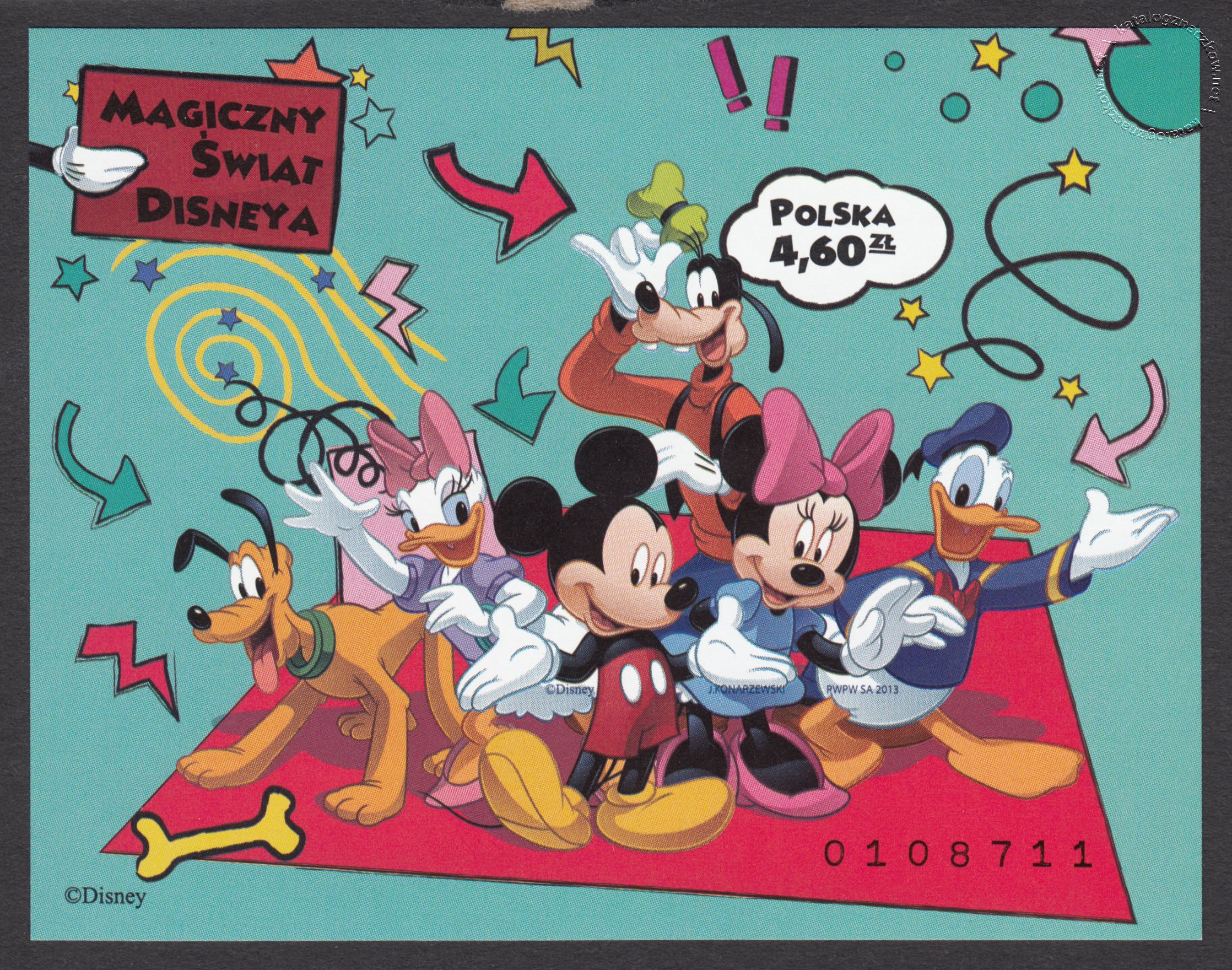 Opis: Na znaczku przedstawiono myszkę Miki, Minnie i Goofiego oraz Kaczora Donalda, Daisy i psa Pluto