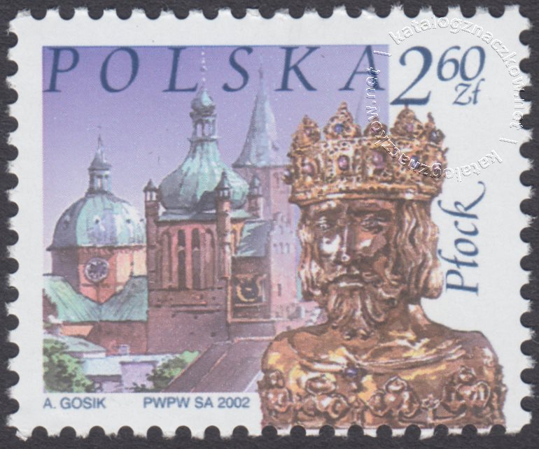 Opis: Płock – herma w tle zamek i katedra na Wzgórzu Tumskim