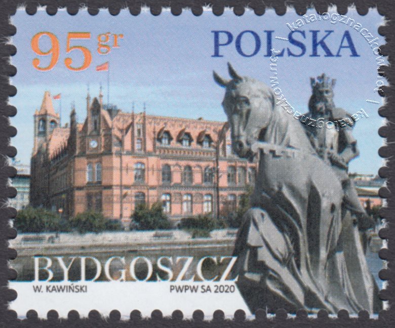 Opis: Na pierwszym planie, przedstawiony został pomnik króla Kazimierza Wielkiego, który w roku 1346 nadał Bydgoszczy prawa miejskie. Na drugim planie widnieje reprezentacyjny budynek Poczty Polskiej – jedna z architektonicznych wizytówek miasta. XIX-wieczny neogotycki zespół budynków został pokazany od strony rzeki Brdy