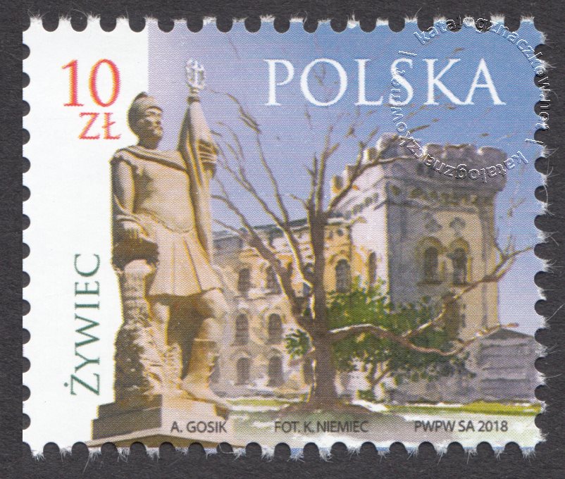 Opis: Figura św. Floriana na tle zamku w Żywcu
