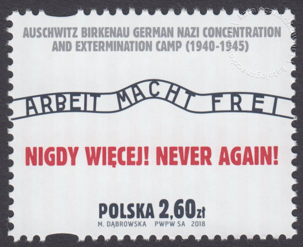 Opis: Na znaczku przedstawiono napis Auschwitz Biiitenau German Nazi Concentration And Bdermination Camp (1940-1945)