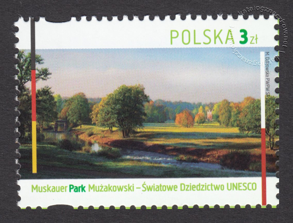 Opis: Fragment parku i barwy narodowe Polski i Niemiec.