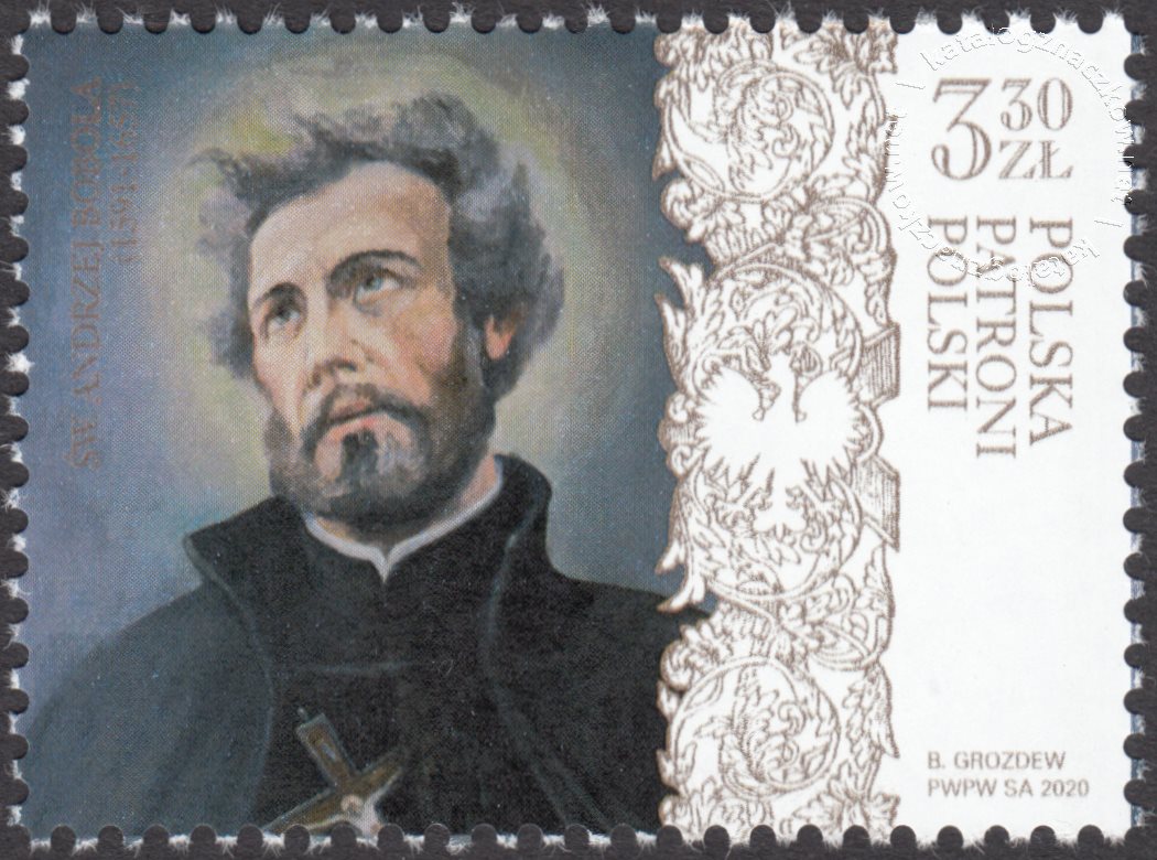 Opis: Podobizna św. Andrzeja Boboli z obrazu autorstwa br. Bronisława Podsiadłego SJ oraz roślinny motyw ozdobny z orłem w koronie