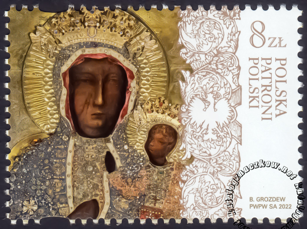 Opis: Wizerunek Matki Bożej Jasnogórskiej oraz roślinny motyw ozdobny z orłem w koronie.
