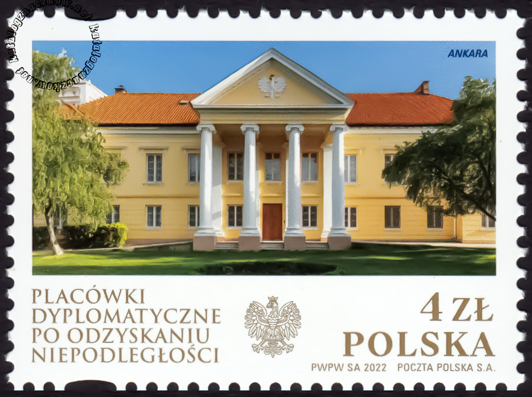 Opis: Na znaczku przedstawiono fronton siedziby ambasady polskiej w Ankarze oraz godło Rzeczypospolitej Polskiej i napis: Ankara. Wzdłuż dolnej krawędzi znaczka umieszczono nazwę emisji „Placówki dyplomatyczne po odzyskaniu niepodległości”, napis: POLSKA i oznaczenie nominału: 4 zł.
