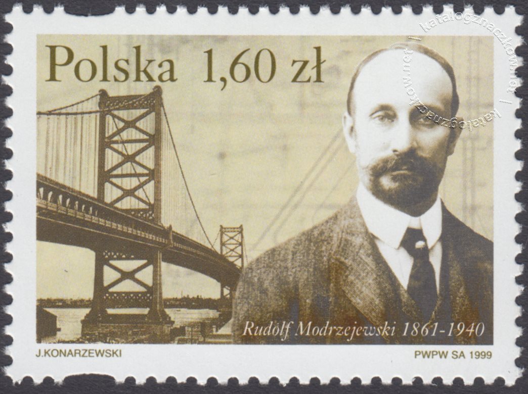 Opis: Rudolf Modrzejewski; w tle most Benjamin Franklin na rzece Delaware w Filadelfii