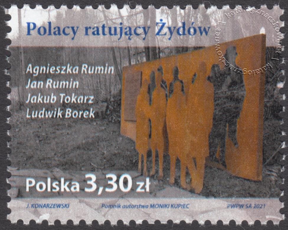 Opis: Na znaczku przedstawiono zdjęcie pomnika autorstwa Moniki Kupiec, znajdującego się w Popardowej gm. Nawojowa, upamiętniającego wydarzenia z marca 1944 r., przedstawiającego kontury sylwetek czwórki Polaków zasłaniających sobą sześcioro Żydów. W lewym dolnym rogu znaczka umieszczono napis Polska oraz oznaczenie wartości 3,30 zł, natomiast wzdłuż górnej krawędzi – Polacy ratujący Żydów oraz umieszczono nazwiska czterech Polaków: Agnieszka Rumin, Jan Rumin, Jakub Tokarz i Ludwik Borek.