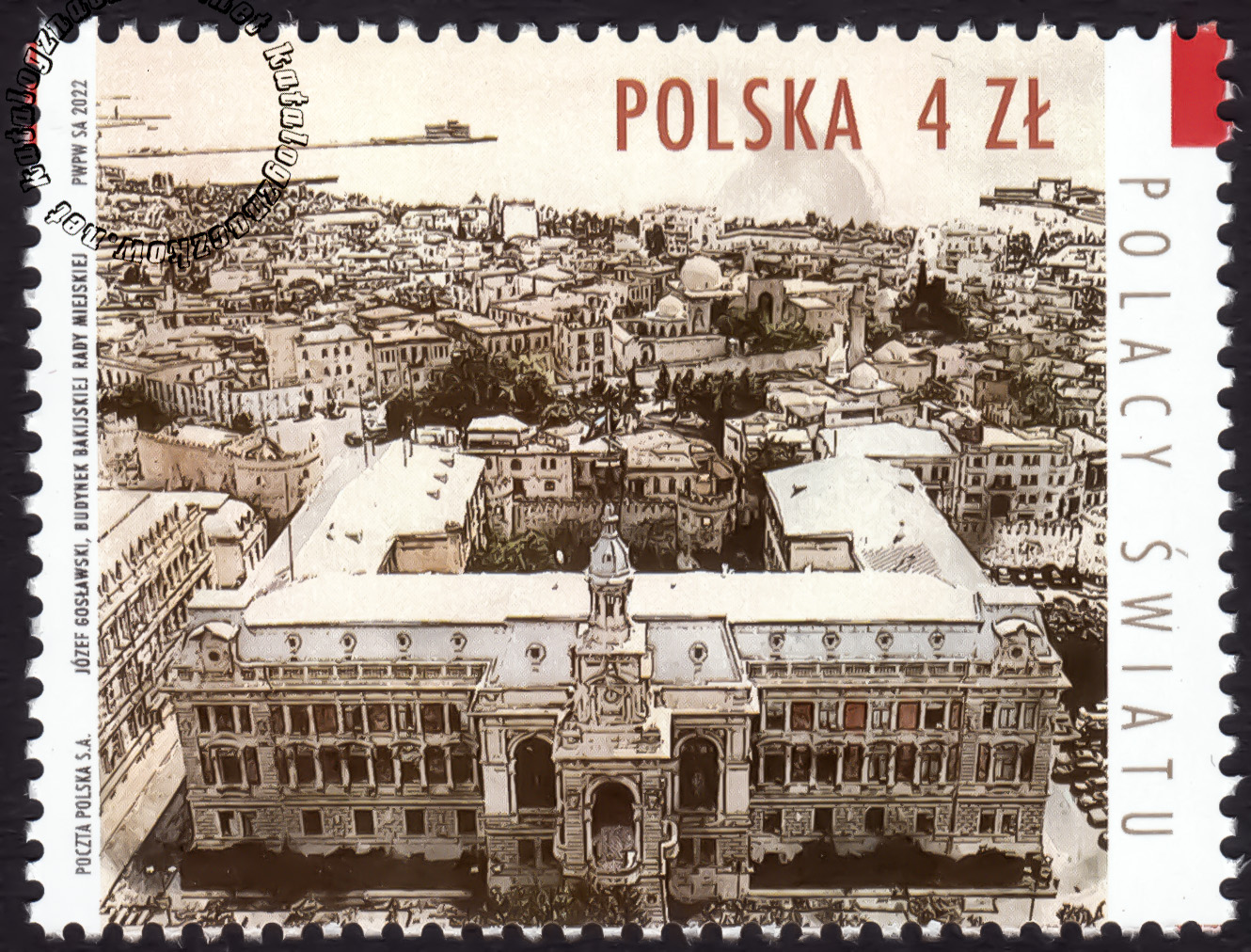 Opis: Na znaczku przedstawiono gmach Rady Miejskiej w Baku ,którego twórcą jest polski architekt Józef Gosławski (1865-1904). Wzdłuż górnej krawędzi znaczka umieszczono napisy: POLSKA i oznaczenie nominału 4 zł,a wzdłuż prawej krawędzi umieszczono napis: Polacy światu. Na kopercie FDC umieszczono archiwalne zdjęcie Józefa Gosławskiego z rodziną.