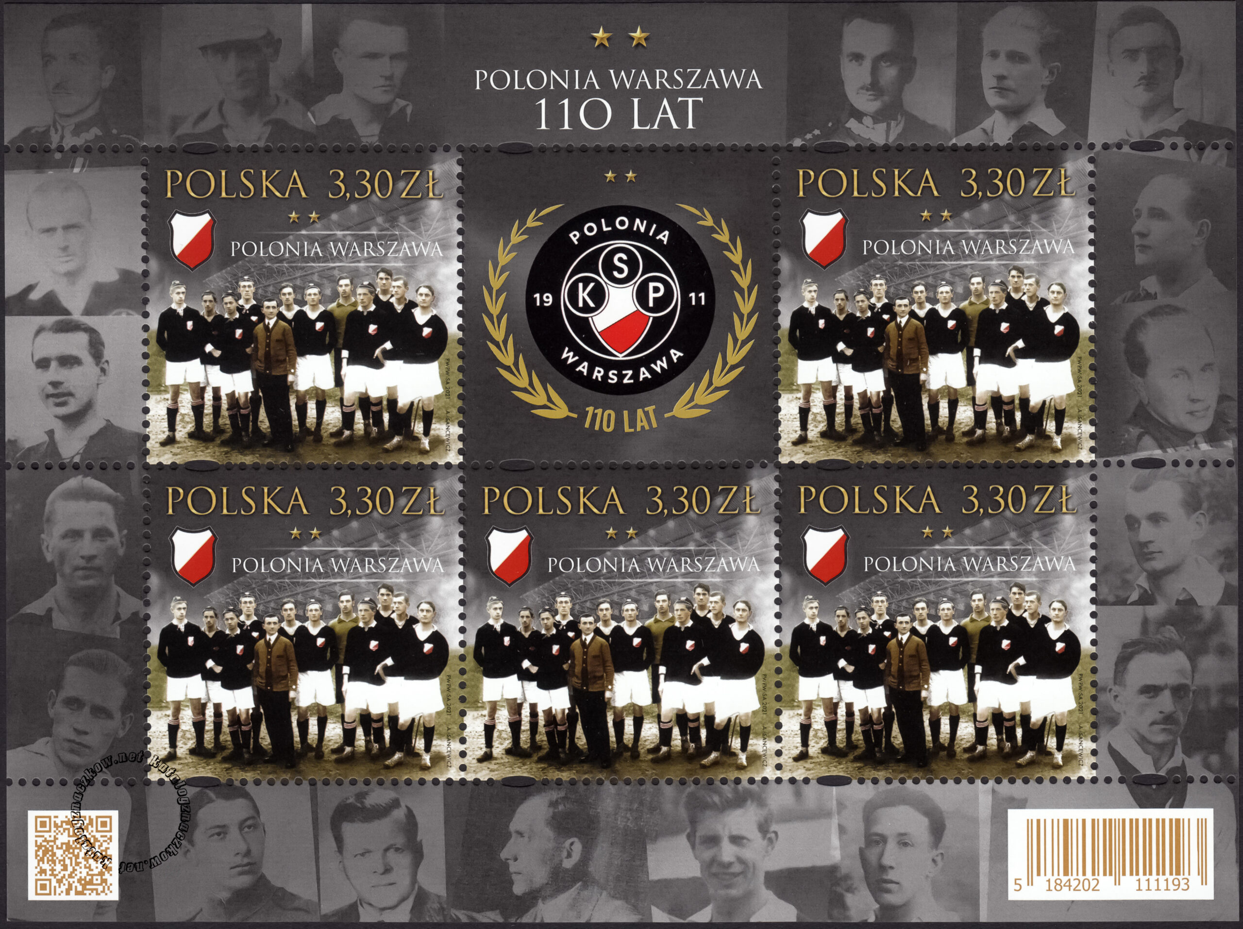 Opis: Na znaczku umieszczono koloryzowane zdjęcie z 1916 r. drużyny Polonii Warszawa, w centralnej części umieszczono pierwszy historyczny herb oraz napis: POLONIA WARSZAWA a nad nim dwie gwiazdki symbolizujące liczbę zdobytych tytułów ,,Mistrza Polski”, w tle widnieją trybuny stadionu przy ulicy Konwiktorskiej w Warszawie, natomiast wzdłuż górnej krawędzi napis: POLSKA i oznaczenie wartości: 3,30 zł.