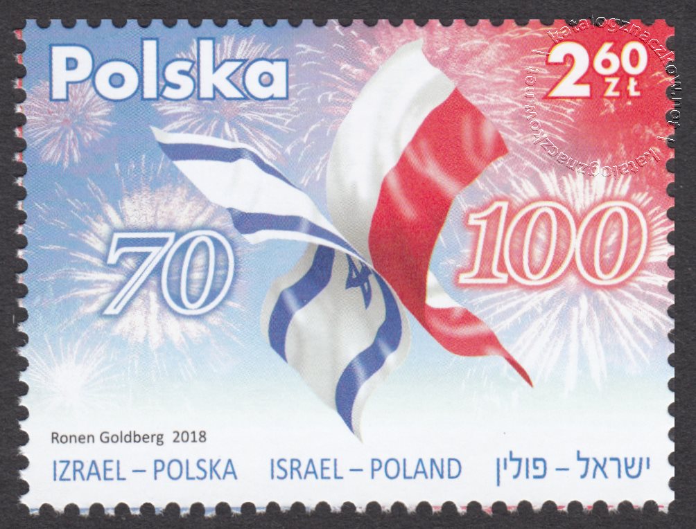 Opis: Na znaczku przedstawiono dwie flagi: izraelską i polską, połączone ze sobą w formie motyla; po lewej stronie umieszczono liczbę 70, nawiązującą do 70. rocznicy proklamacji niepodległości Izraela, a po prawej stronie – liczbę 100, symbolizującą 100. rocznicę odzyskania niepodległości przez Polskę