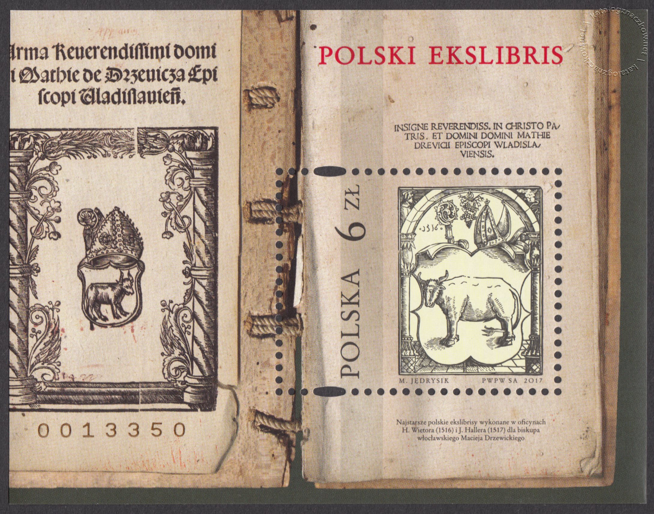 Opis: Na znaczku przedstawiono grafikę najstarszego polskiego ekslibrisu z 1516 roku