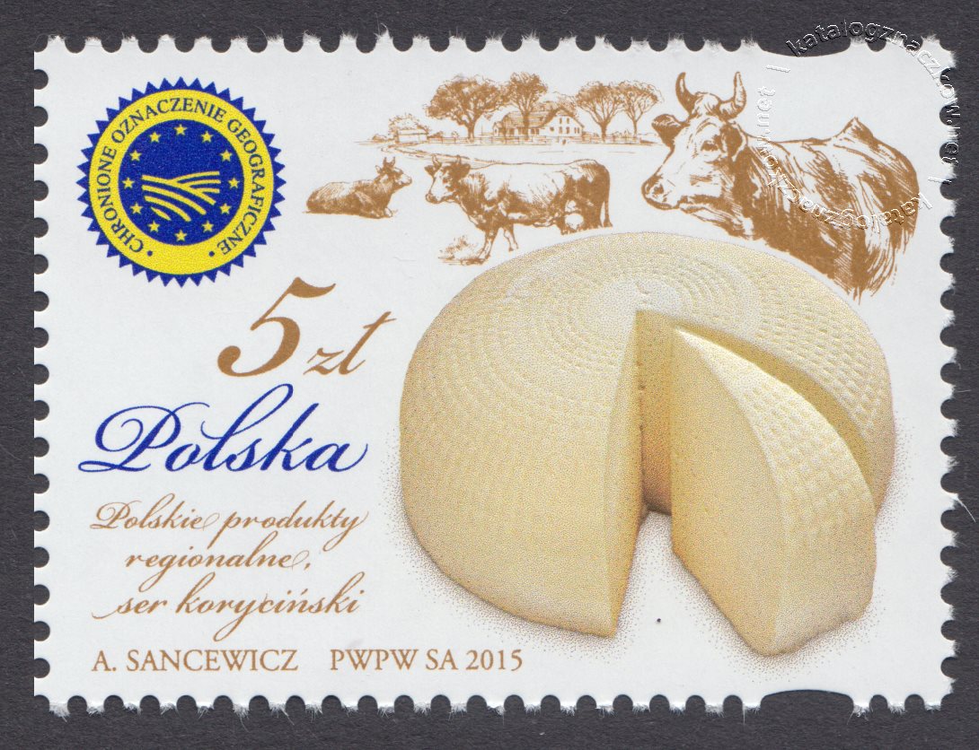 Opis: Ser koryciński, krowy i zabudowania wśród drzew oraz znak Chronione Oznaczenie Geograficzne