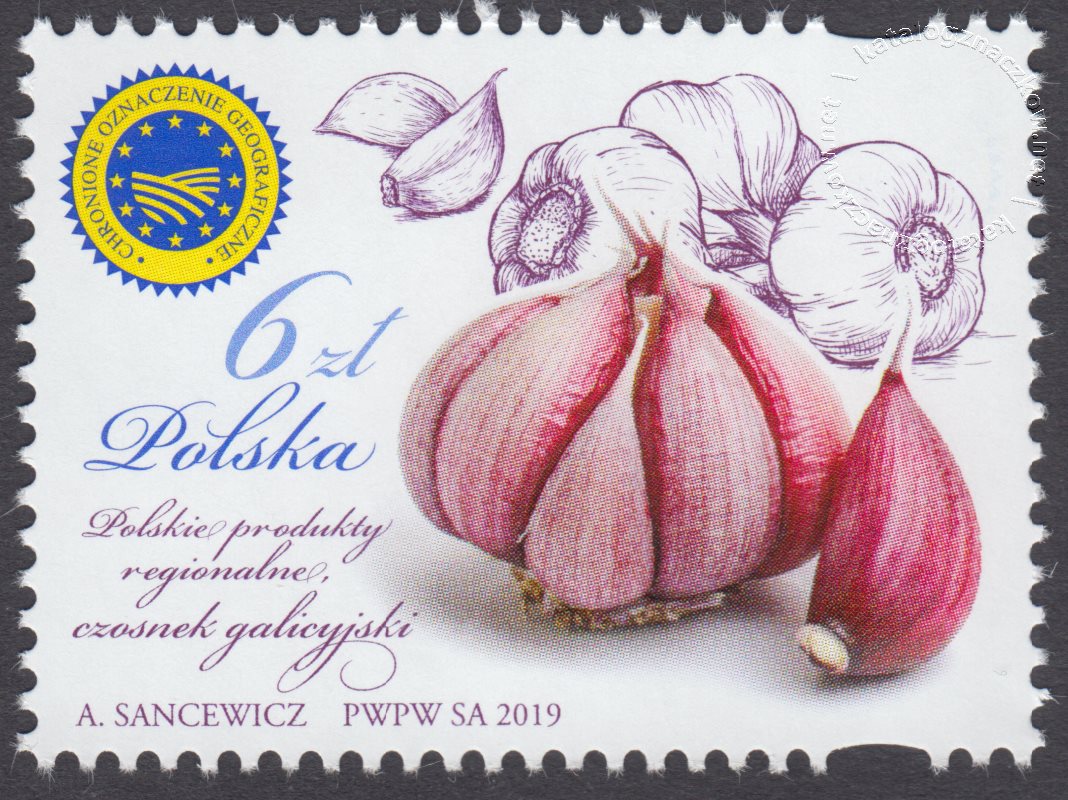 Opis: Zdjęcie czosnku galicyjskiego, w lewym górnym rogu umieszczono znak; Chronione Oznaczanie Geograficzne