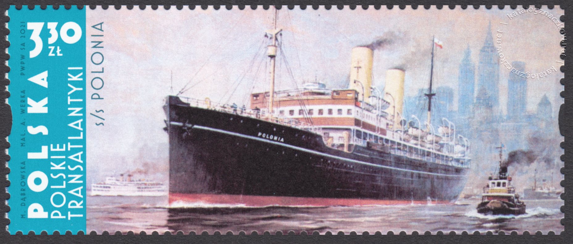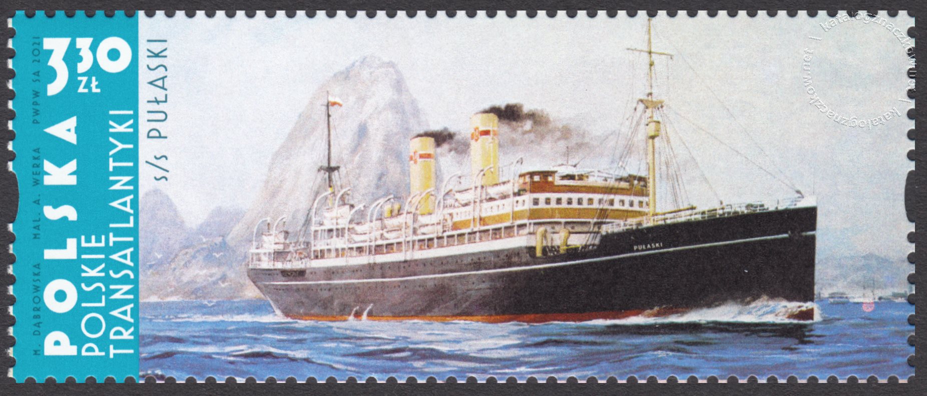 Opis: Transatlantyk s/s Pułaski, a wzdłuż lewej krawędzi znaczka umieszczono napis: s/s PUŁASKI. Wzdłuż lewej krawędzi znaczków umieszczono napis: POLSKA, pod nim napis: POLSKIE TRANSATLANTYKI, a w lewym górnym rogu oznaczenie wartości: 3,30 zł.