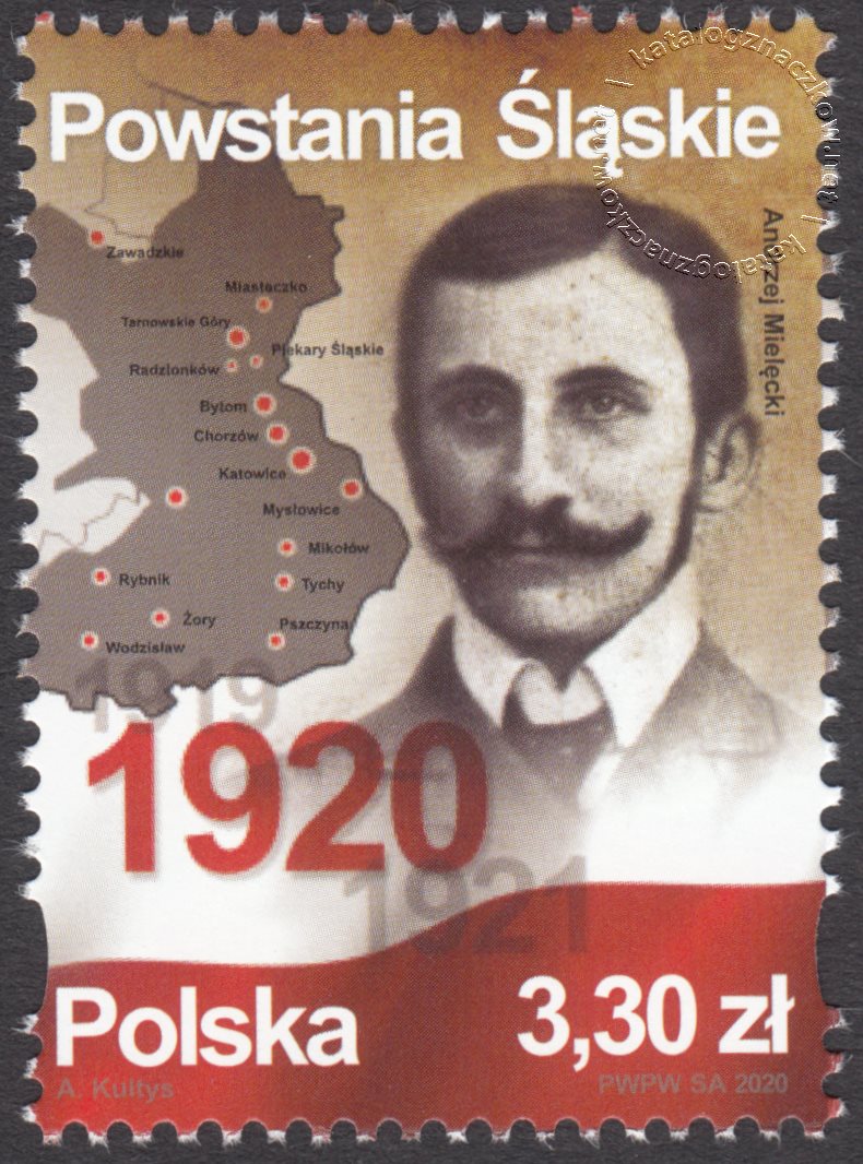Opis: Na znaczku, po prawej stronie, przedstawiono postać Andrzeja Mielęckiego, a po lewej – mapę zasięgu II Powstania Śląskiego. W dolnej części znaczka umieszczono wizerunek flagi polskiej, natomiast w centralnej części wskazano daty roczne wybuchu Powstań Śląskich: 1919, 1920, 1921