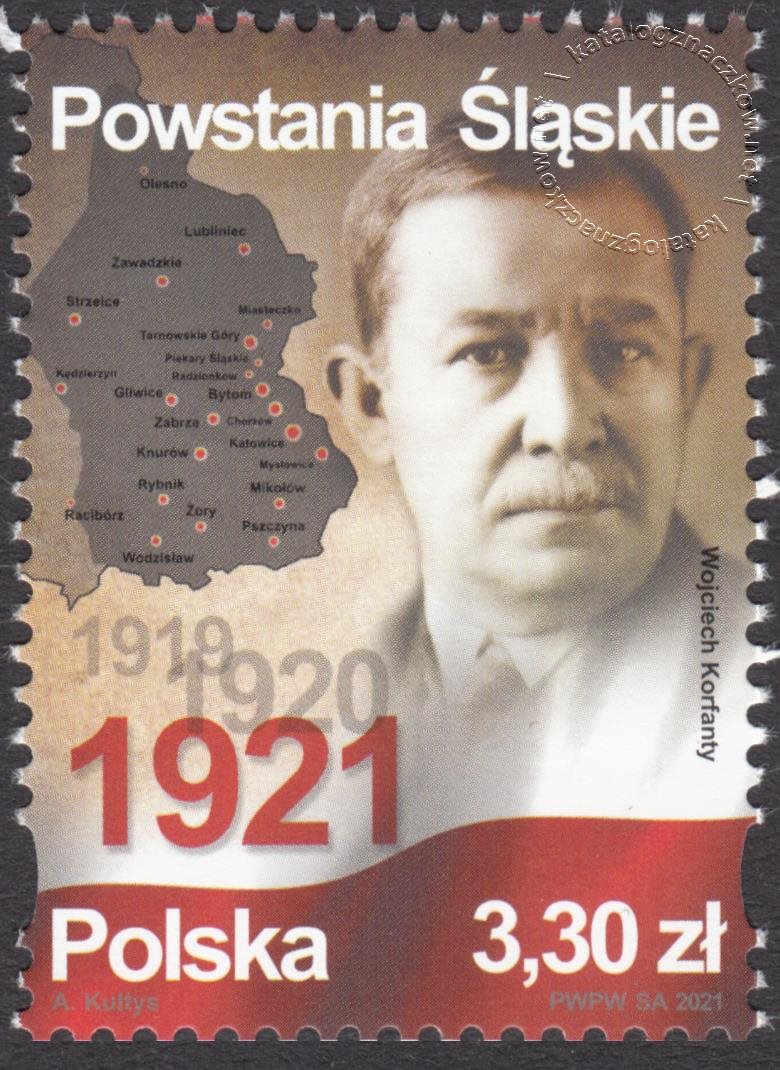 Opis: Postać Wojciecha Korfantego, a po lewej mapę zasięgu III Powstania Śląskiego. W dolnej części znaczka umieszczono wizerunek flagi polskiej, natomiast w centralnej części wskazano daty roczne wybuchu Powstań Śląskiej: 1919, 1920, 1921. Na kopercie został pokazany Powstańczy ciężki karabin maszynowy Maxim wz. 1908 na podstawie saneczkowej w akcji nas Odrą.