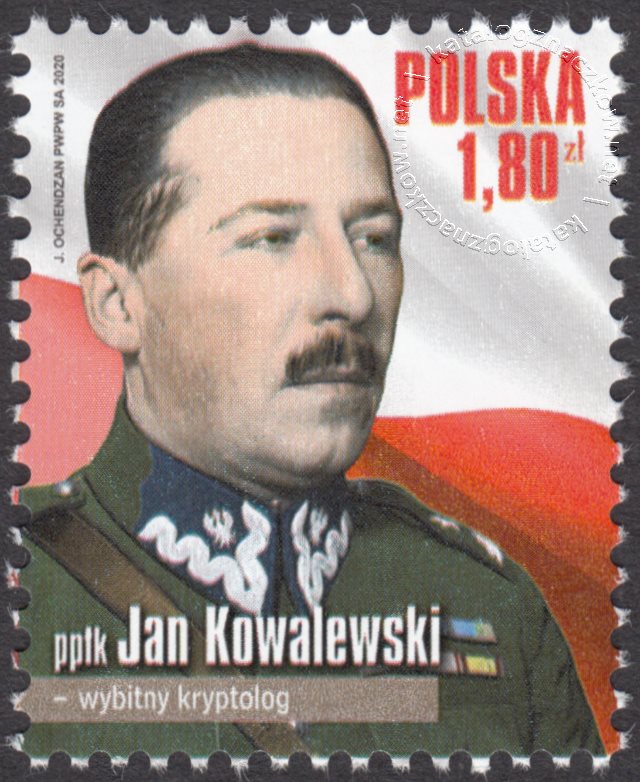 Opis: Postać Jana Kowalewskiego na tle biało-czerwonej flagi