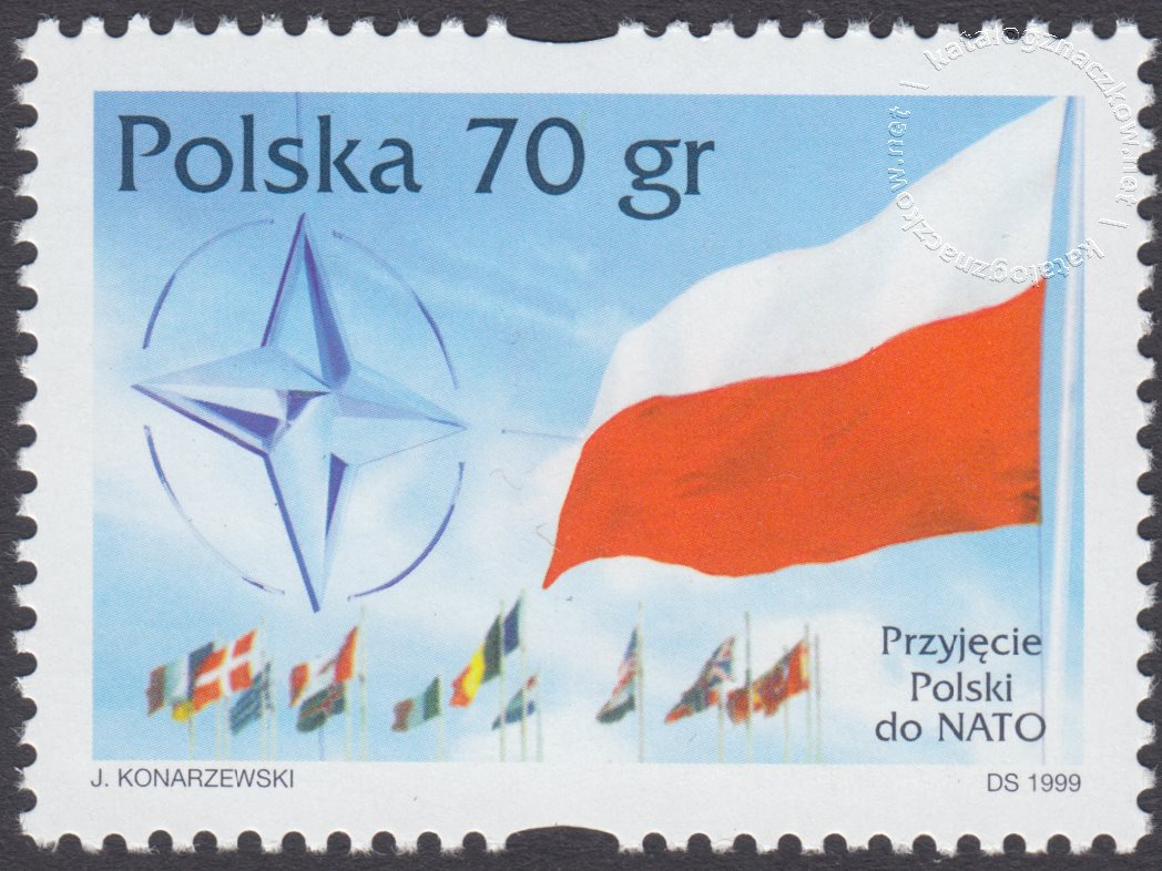 Opis: Emblemat NATO; flaga Polski i flagi państw członkowskich
