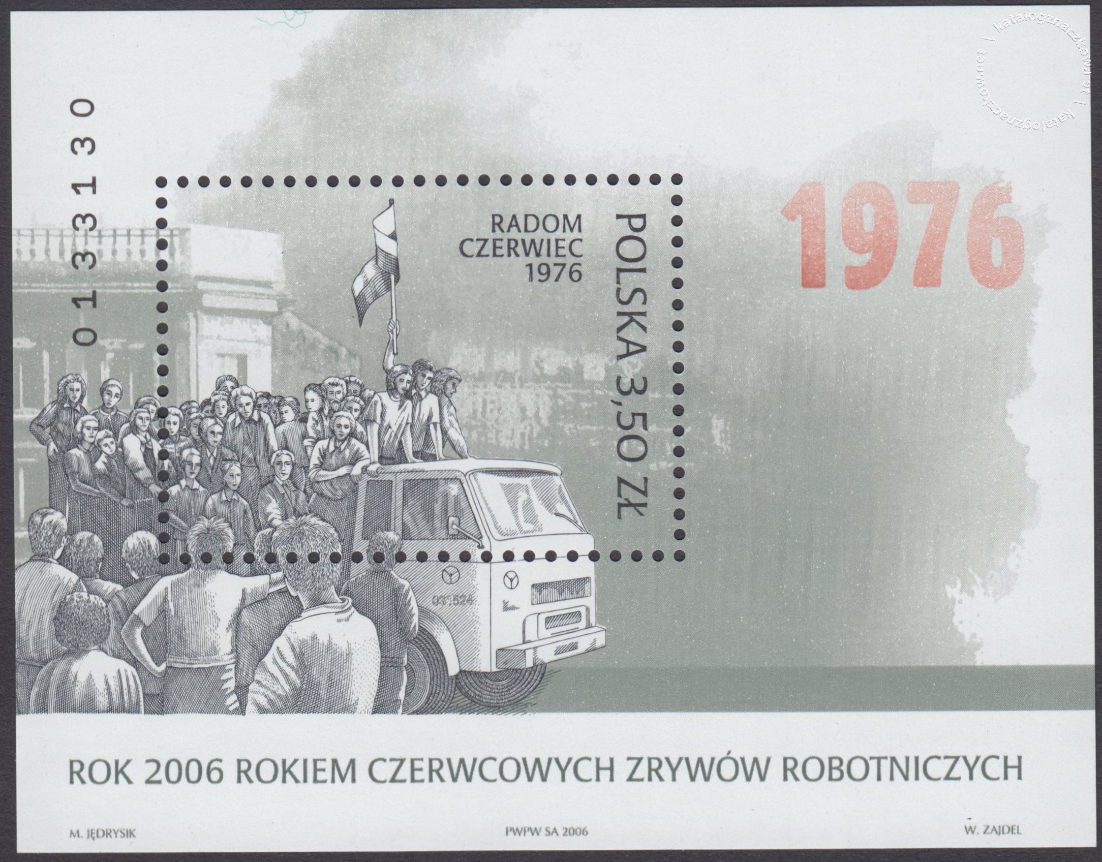 Opis: Strajkujący jadący ciężarówką na tle płonącego budynku KW PZPR w Radomiu