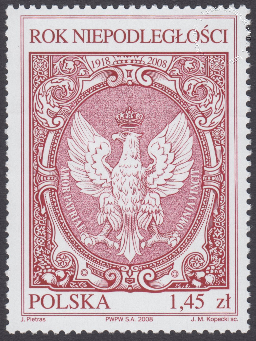 Opis: Wizerunek Orła Białego w koronie z okresu po odzyskaniu niepodległości, otoczonego wzniosłą dewizą, napisaną po łacinie: AMOR PATRIAE OMNIA VINCIT (Miłość do Ojczyzny wszystko zwycięża)