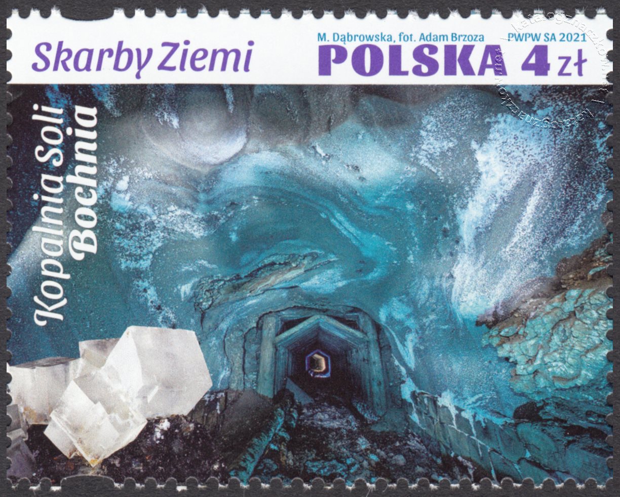 Opis: Na znaczku przedstawiono Kopalnię Soli Bochnia, w lewym dolnym rogu kryształy soli kamiennej; wzdłuż górnej krawędzi umieszczono napisy: SKARBY ZIEMI oraz POLSKA, a w prawym górnym rogu oznaczenie wartości nominalnej: 4 zł. Dodatkowo wzdłuż lewej krawędzi umieszczono napis: Kopalnia Soli Bochnia.