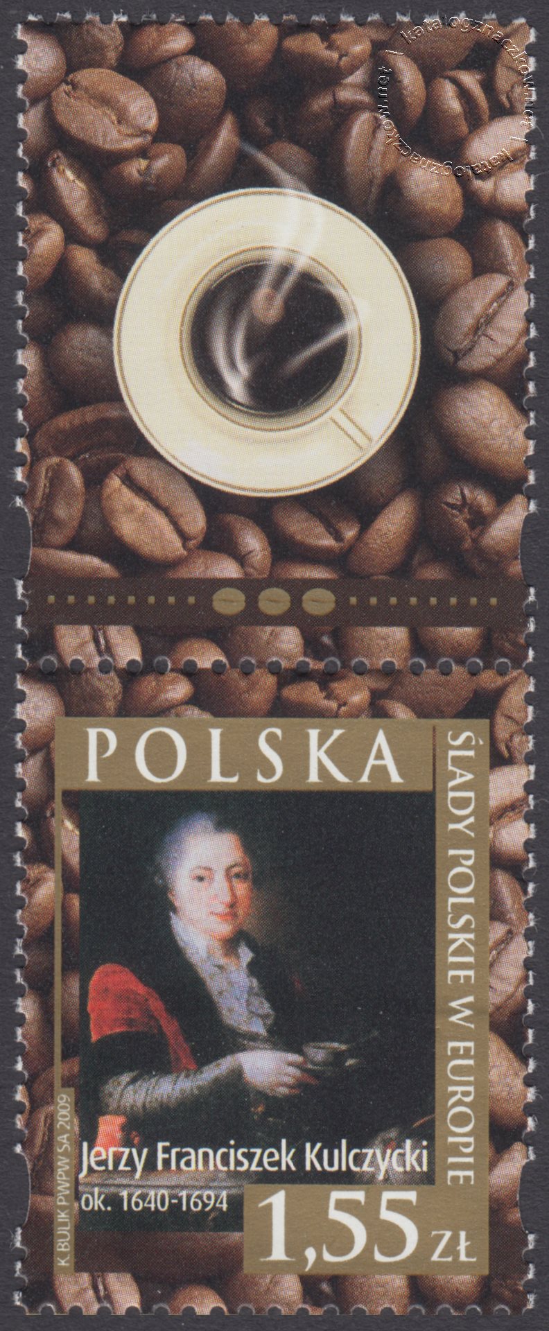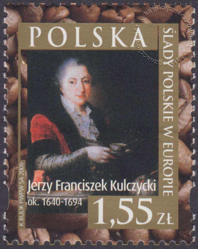 Opis: Jerzy Franciszek Kulczycki na tle ziaren kawy