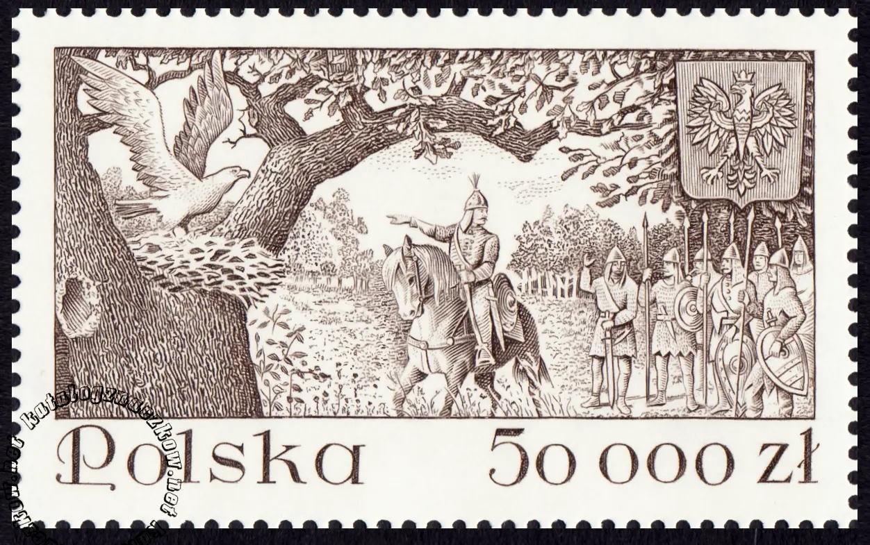 Opis: Ilustracja legendy o Lechu i Orle Białym, godło Rzeczypospolitej Polskiej