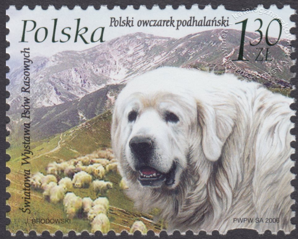 Opis: Wizerunek polskiego owczarka podhalańskiego pilnującego owce