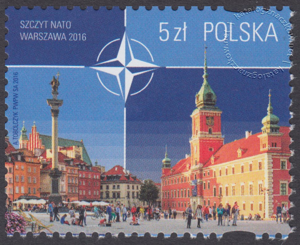 Opis: Panorama Placu Zamkowego w Warszawie oraz gwiazda z logo NATO