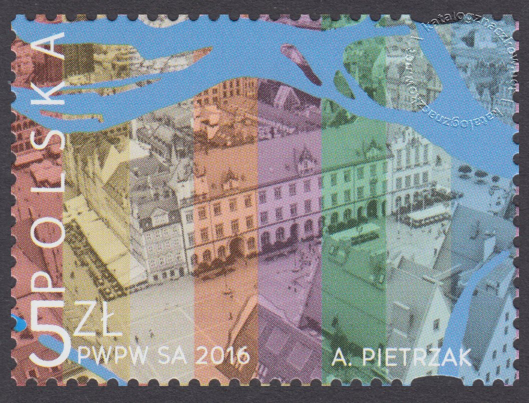 Opis: Na znaczku przedstawiono rynek wrocławski widziany z wieży Kościoła św. Elżbiety i symbolicznie rzekę Odrę.