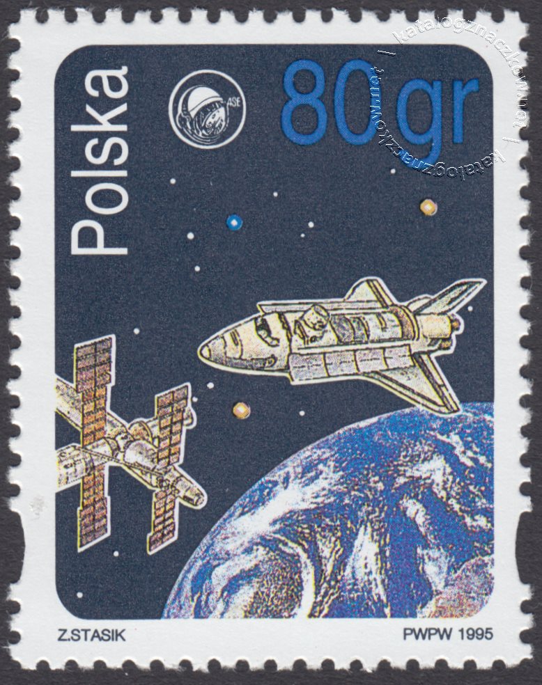 Opis: Rosyjska stacja orbitalna, wahadłowiec amerykański, fragment kuli ziemskiej