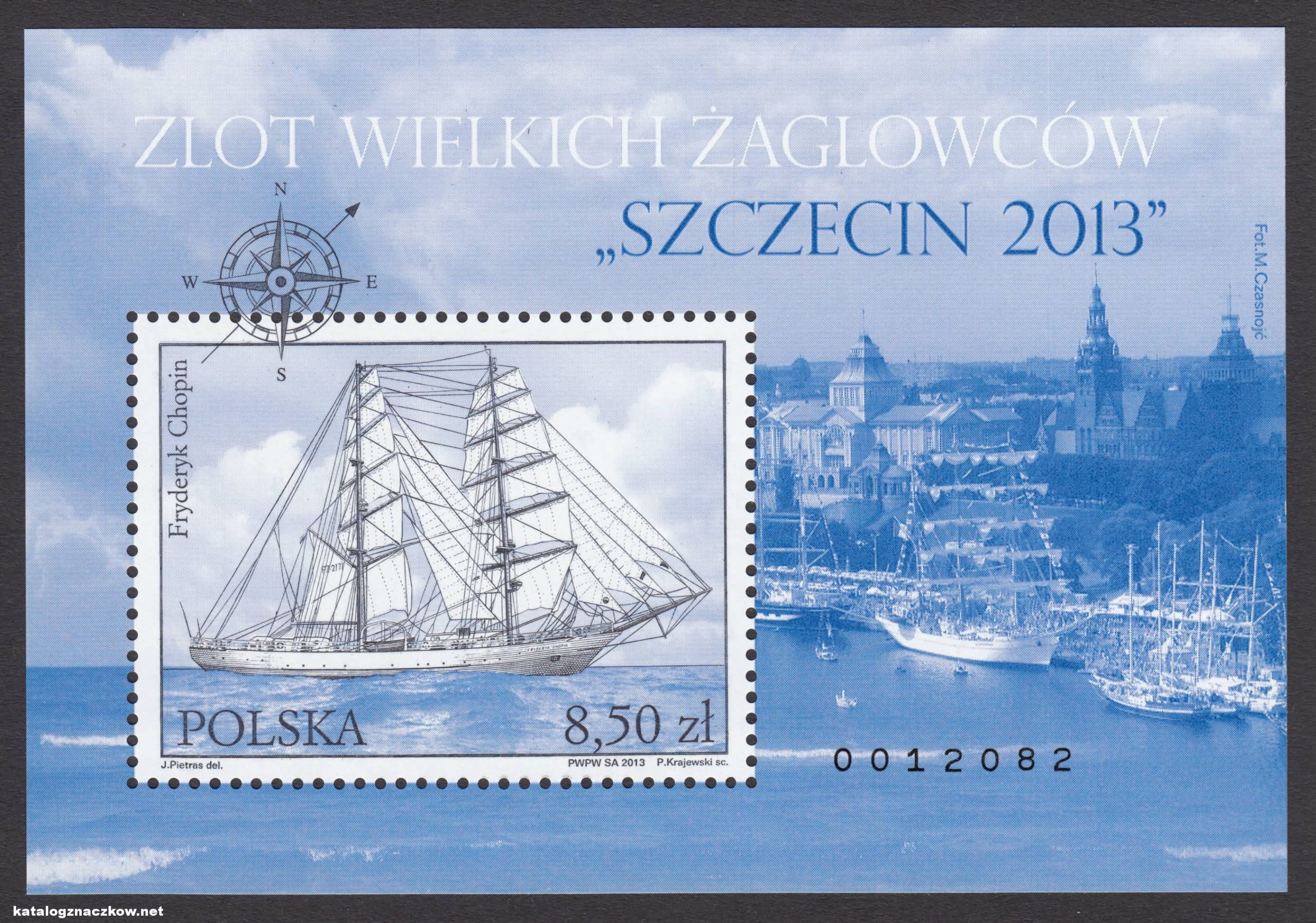 Opis: Żaglowiec Fryderyk Chopin. W tle panorama portu Szczecin.