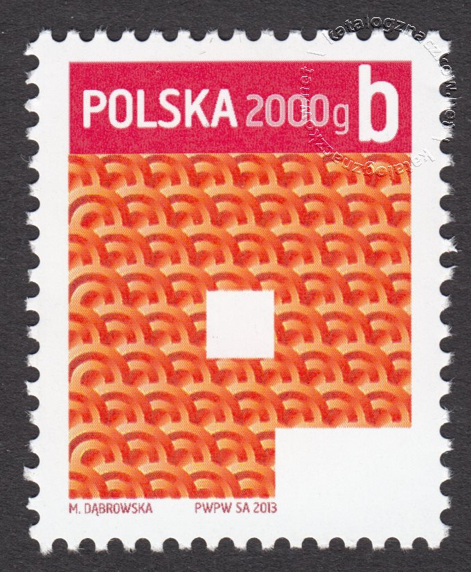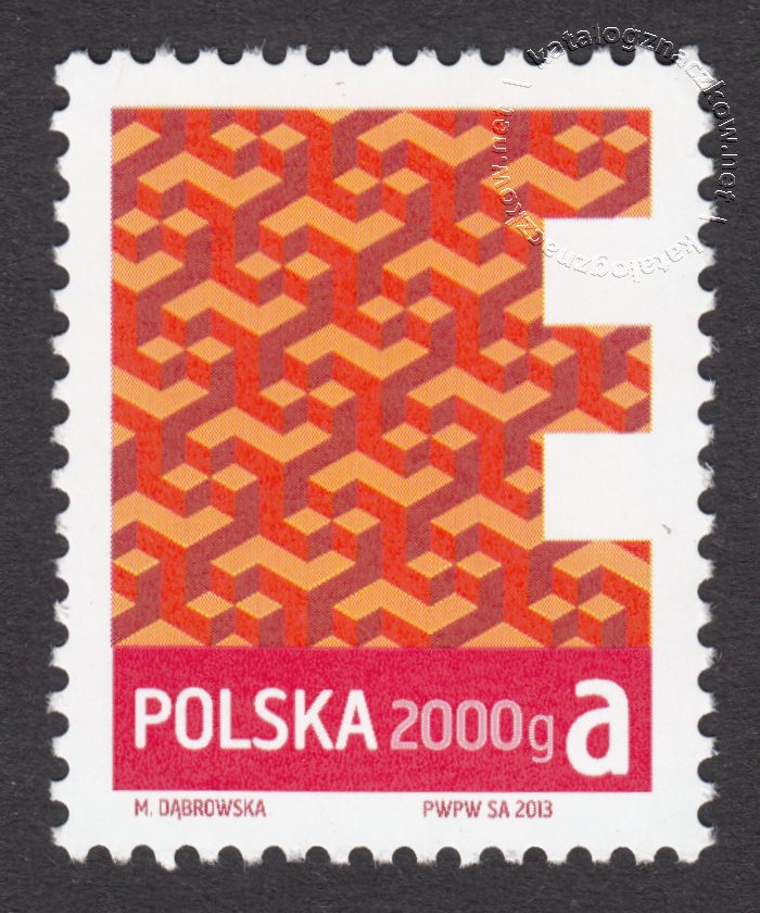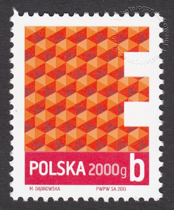Opis: Stylizowana litera P wypełniona wzorami geometrycznymi Znaczek z oznaczeniem kategorii wagowej 2000 g gabarytu B w klasie priorytetowej.