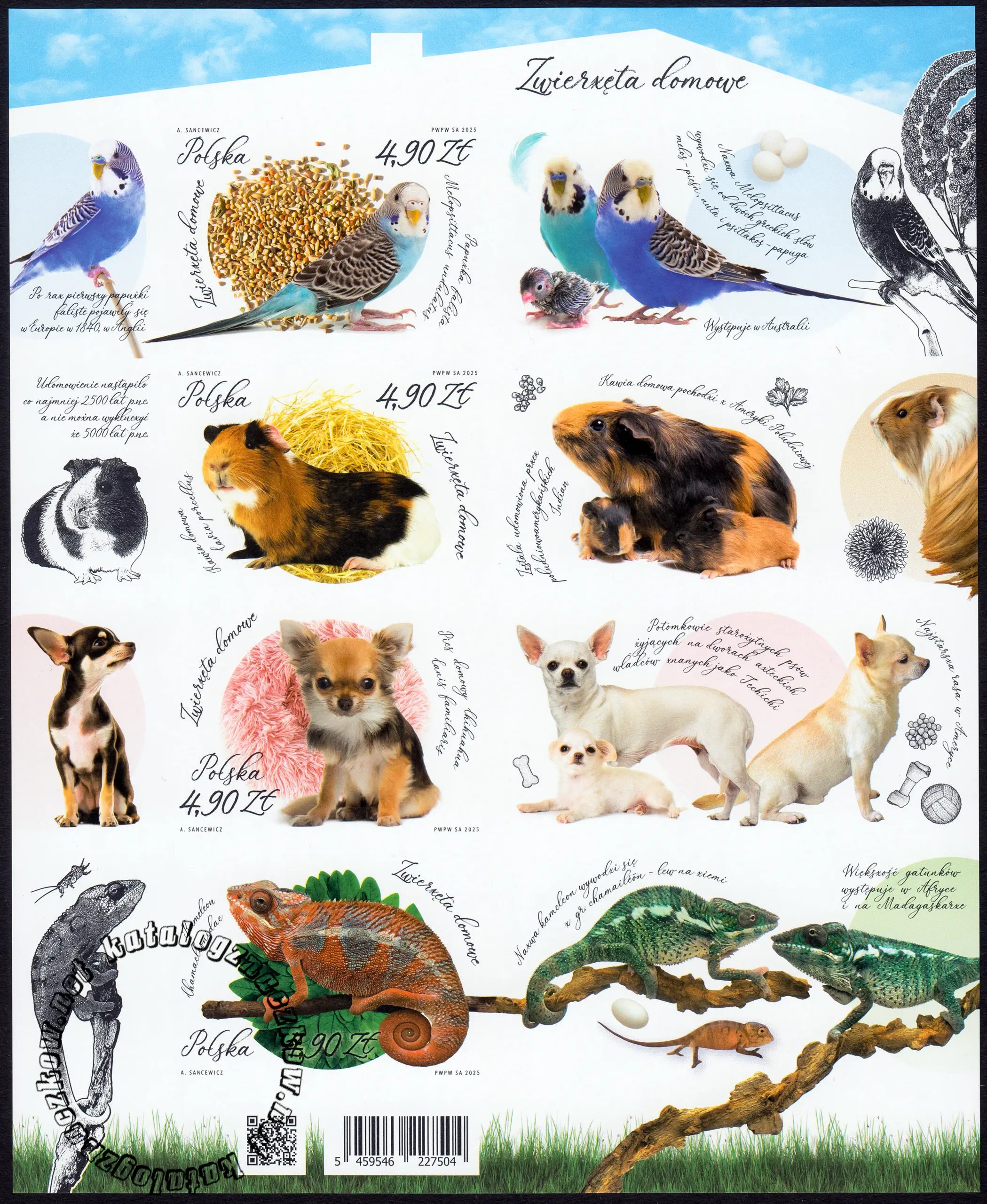 Opis: Papużka falista – Melopsittacus undulatus, Kawia domowa – Cavia porcellus, Pies rasy chihuahua – Chihuahua Canis familiaris, Kameleon – Chamaeleonidae