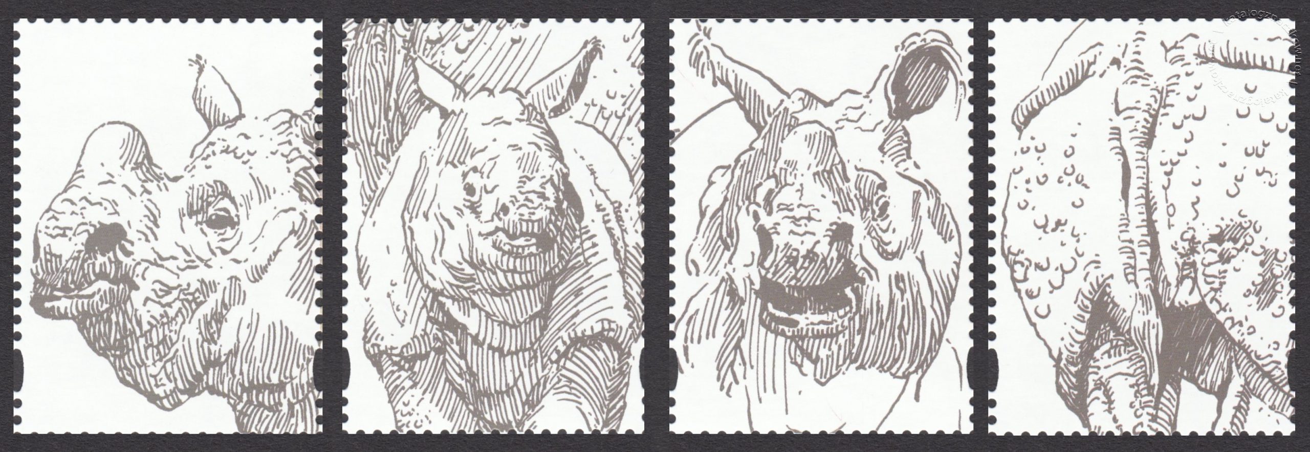 Opis: Na znaczku przedstawiono nosorożca indyjskiego